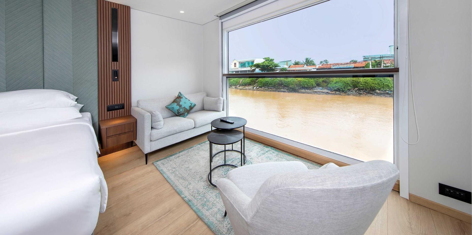 Our staterooms boast ample space in which to relax. Enjoy your time in your home-away-from-home, with everything you could possibly need, including porthole river views for seeing the picturesque landscape of Southeast Asia pass by.